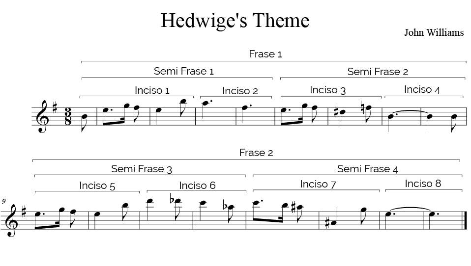Analizziamo adesso un estratto di “Hedwige’s Theme” (John Williams), celebre tema tratto dalla colonna sonora dei film di Harry Potter, che rappresenta un perfetto esempio di costruzione di periodo musicale in ogni sua parte.