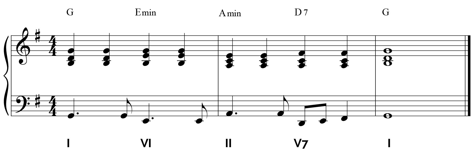 G (T) – Emin (T) – Amin (S) – D7 (T) – G (T)